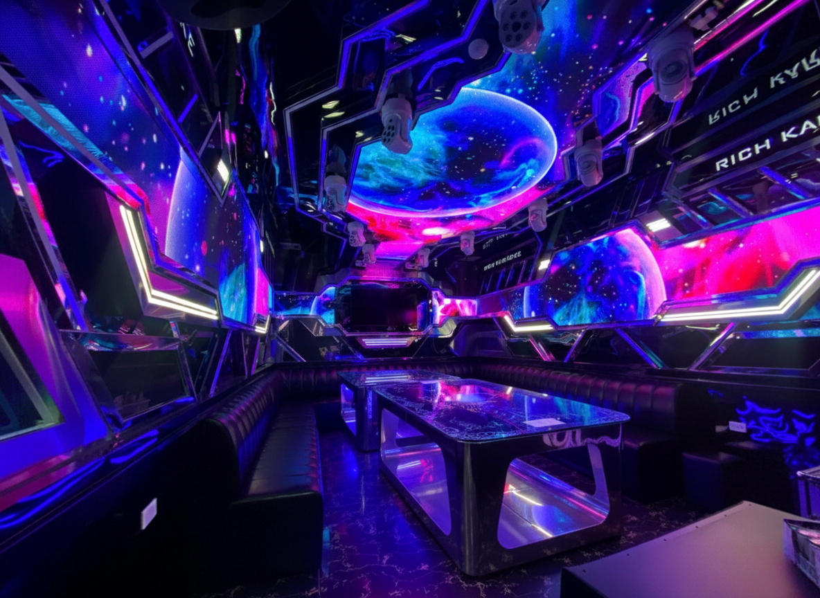 Vũ khí chính của phong cách này chính là hệ thống ánh sáng LED RGB và màn hình LED P2, P3. Các dải LED được lập trình thông minh, biến đổi màu sắc và cường độ theo từng giai điệu âm nhạc, tạo ra một "bữa tiệc thị giác" sống động. Vật liệu chủ đạo là các tấm tiêu âm dạng khối 3D, gỗ công nghiệp, và kính. Thay vì sofa nặng nề, các bộ ghế ngồi được thiết kế đơn giản nhưng thoải mái, tối ưu diện tích và tạo cảm giác không gian rộng rãi hơn.
